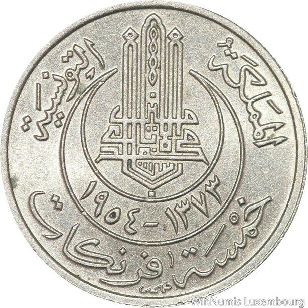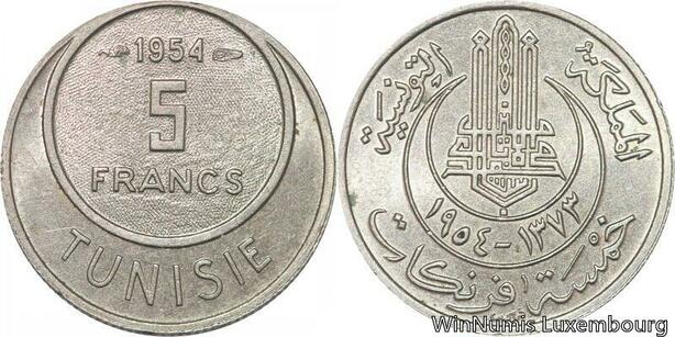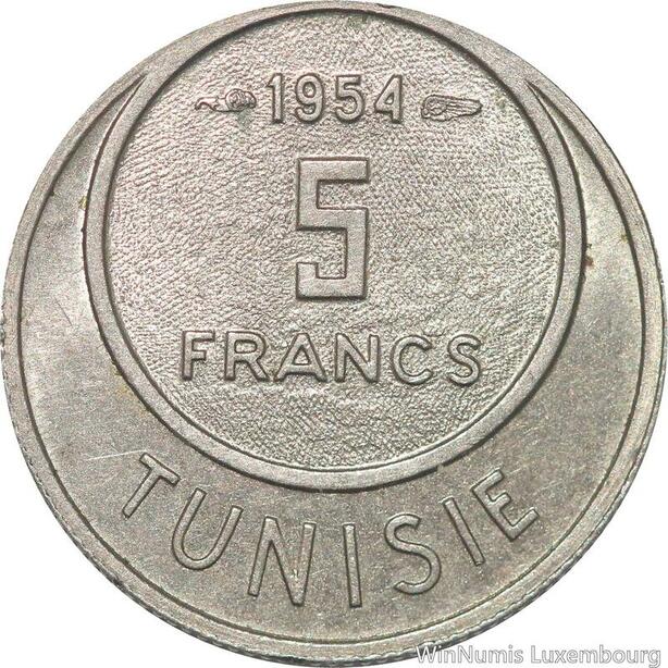 R8101 Tunisia 5 Francs Muhammad al-Amin Bey AH 1373 1954 Paris AU