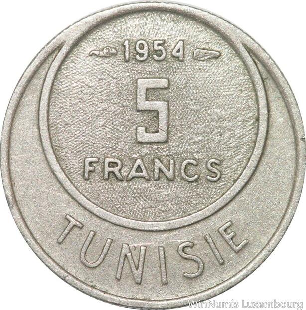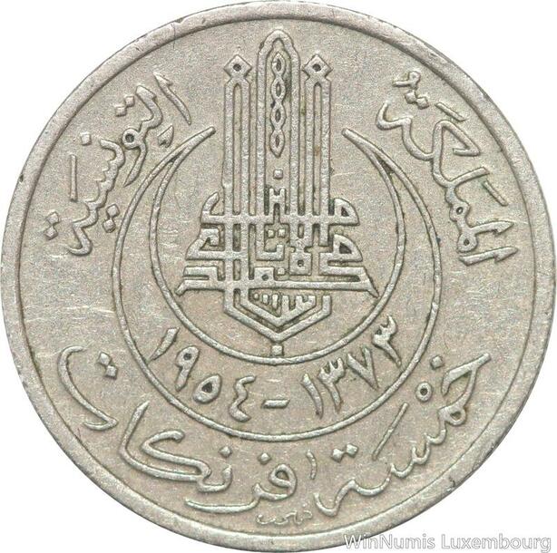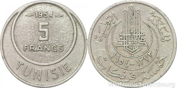 R8121 Tunisia 5 Francs Muhammad al-Amin Bey AH 1373 1954 Paris