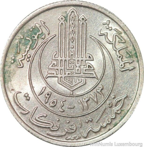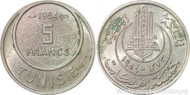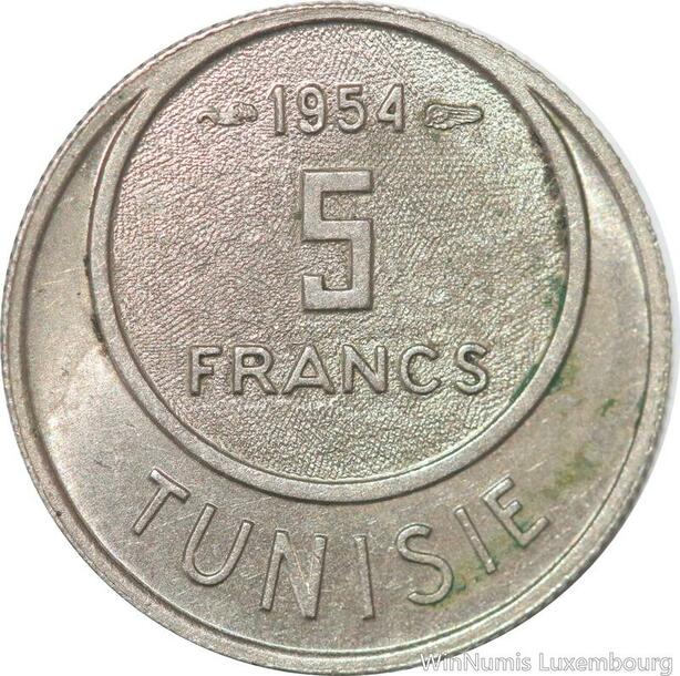 R8123 Tunisia 5 Francs Muhammad al-Amin Bey AH 1373 1954 Paris AU