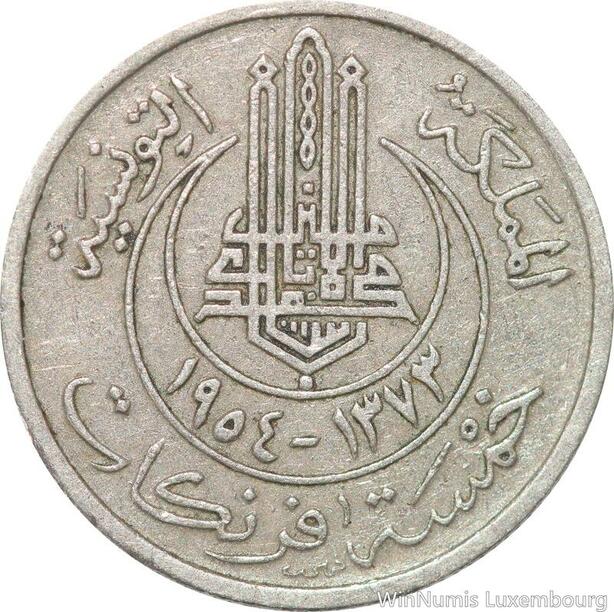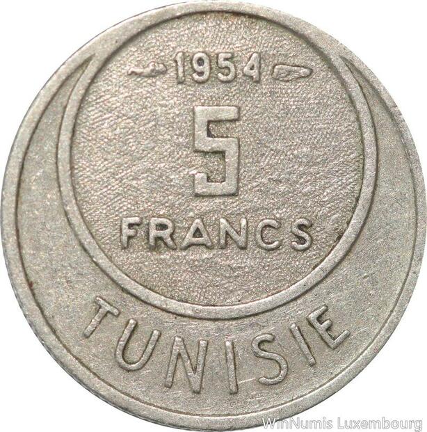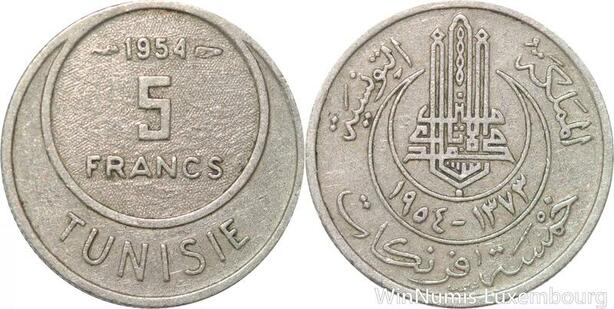 R8126 Tunisia 5 Francs Muhammad al-Amin Bey AH 1373 1954 Paris