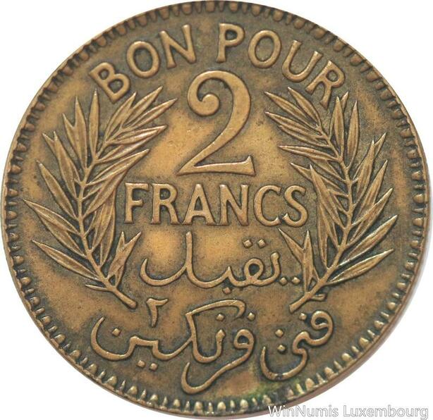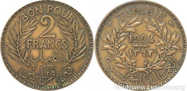 R8148 Tunisia 2 Francs AH 1343 1924 Paris -> Make offer