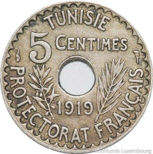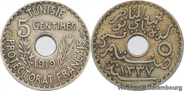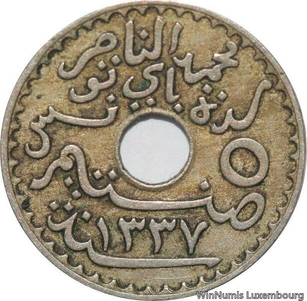 R8469 Tunisia 5 Centimes Muhammad al-Nasir Bey AH 1337 1919 Paris