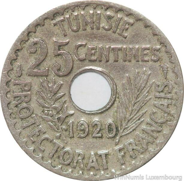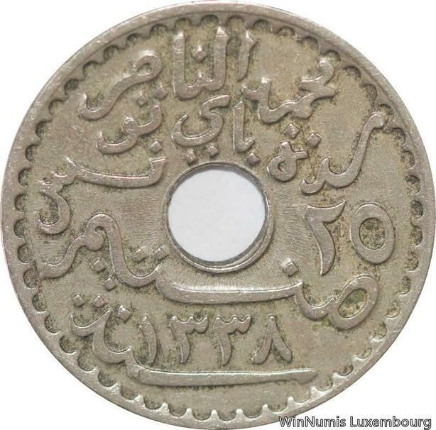 R8492 Tunisia 25 Centimes Muhammad al-Nasir Bey AH 1338 1920 Paris