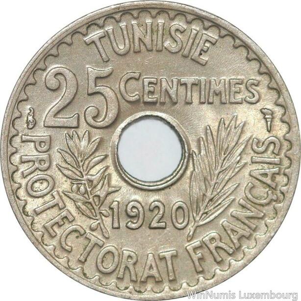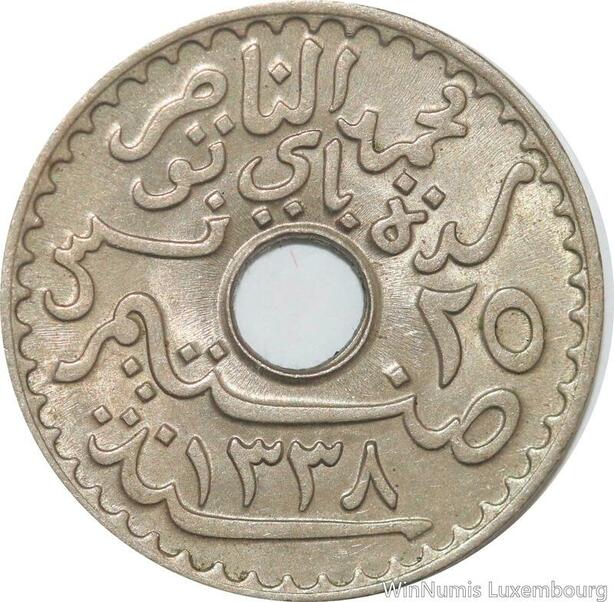 R8500 Tunisia 25 Centimes Muhammad al-Nasir Bey AH 1338 1920 Paris UNC