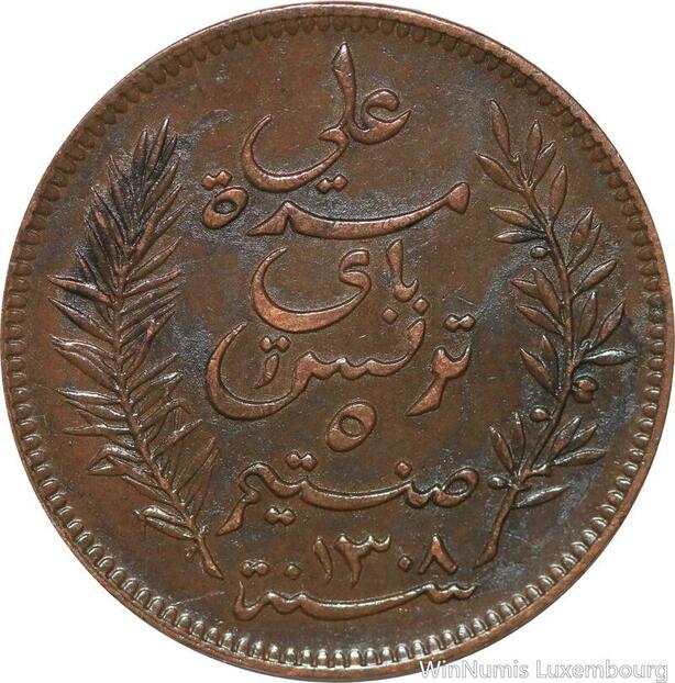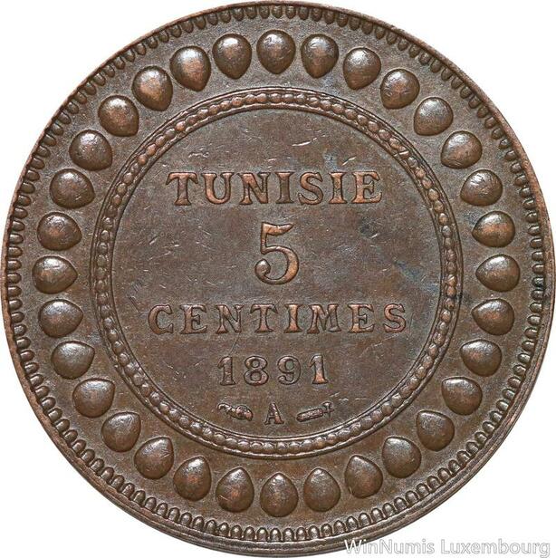 R8552 Tunisia 5 Centimes Muhammad al-Nasir Bey AH 1308 1891 A Paris AU >M Offer