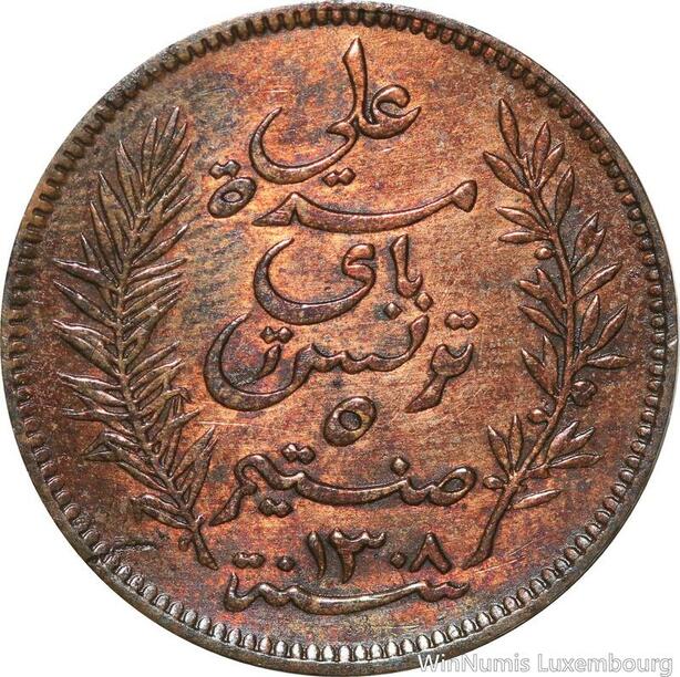 R8553 Tunisia 5 Centimes Muhammad al-Nasir Bey AH 1308 1891 A Paris > Make offer