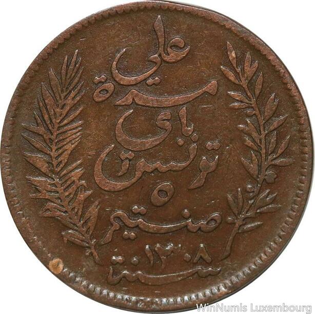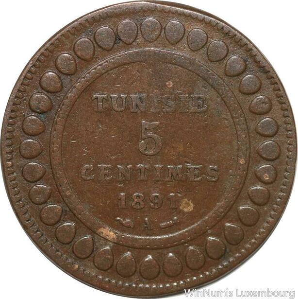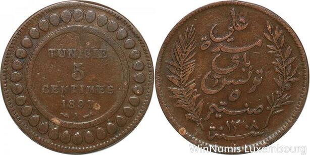 R8555 Tunisia 5 Centimes Muhammad al-Nasir Bey AH 1308 1891 A Paris > Make offer