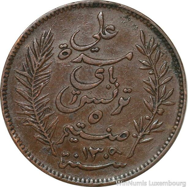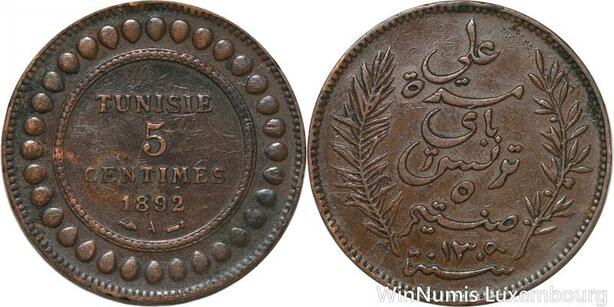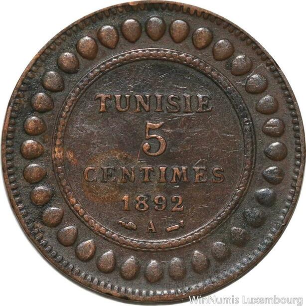 R8556 Tunisia 5 Centimes Muhammad al-Nasir Bey AH 1309 1892 A Paris > Make offer