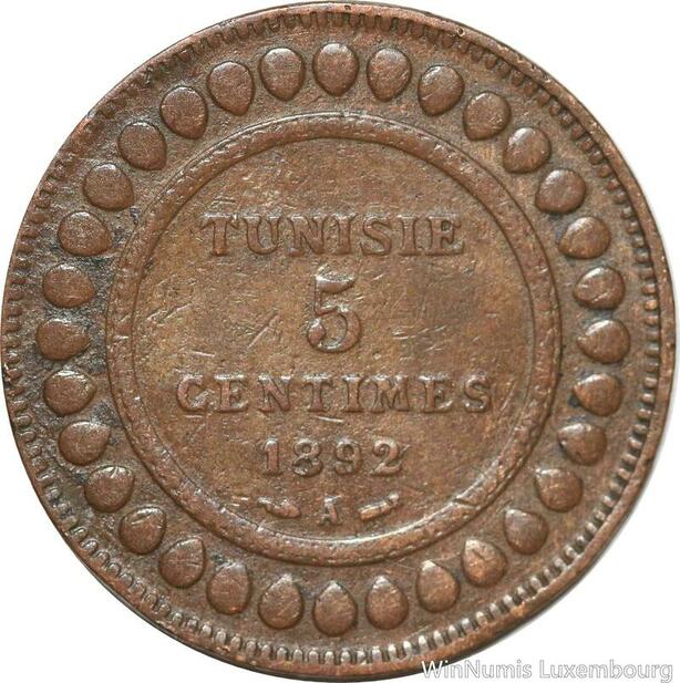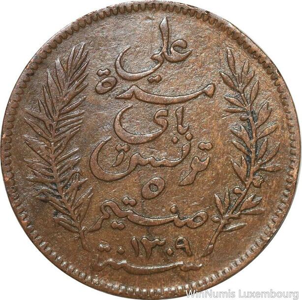 R8559 Tunisia 5 Centimes Muhammad al-Nasir Bey AH 1309 1892 A Paris > Make offer