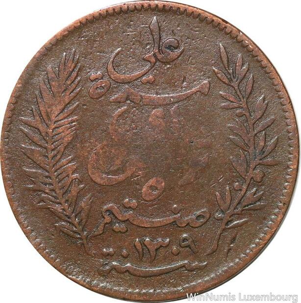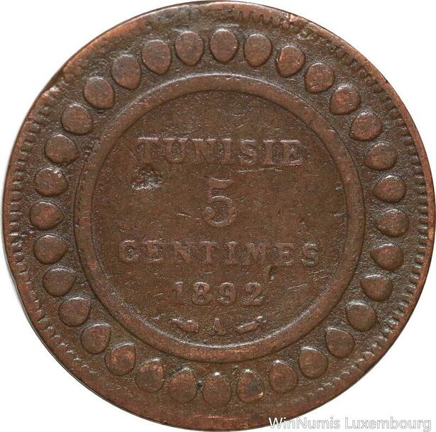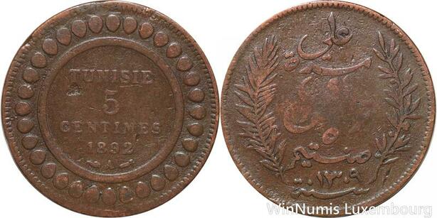 R8561 Tunisia 5 Centimes Muhammad al-Nasir Bey AH 1309 1892 A Paris > Make offer