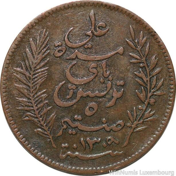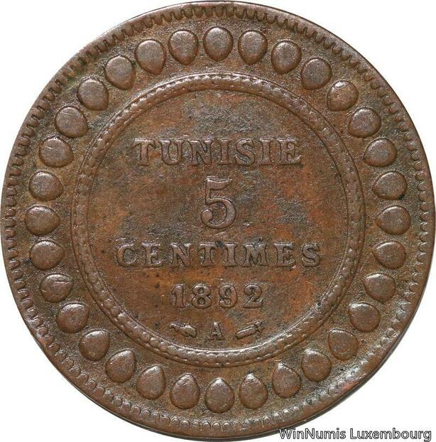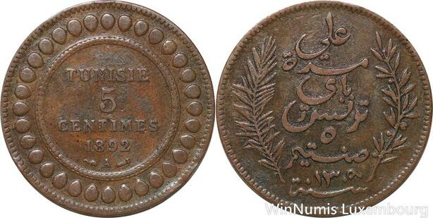 R8562 Tunisia 5 Centimes Muhammad al-Nasir Bey AH 1309 1892 A Paris > Make offer
