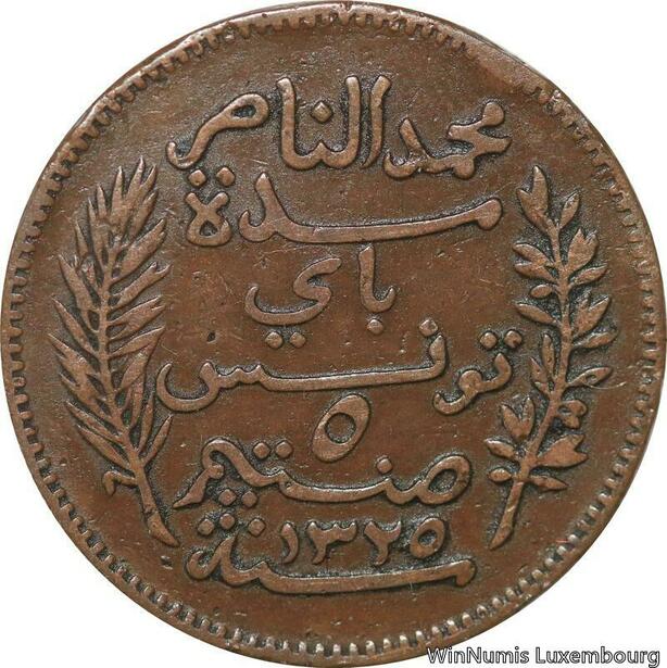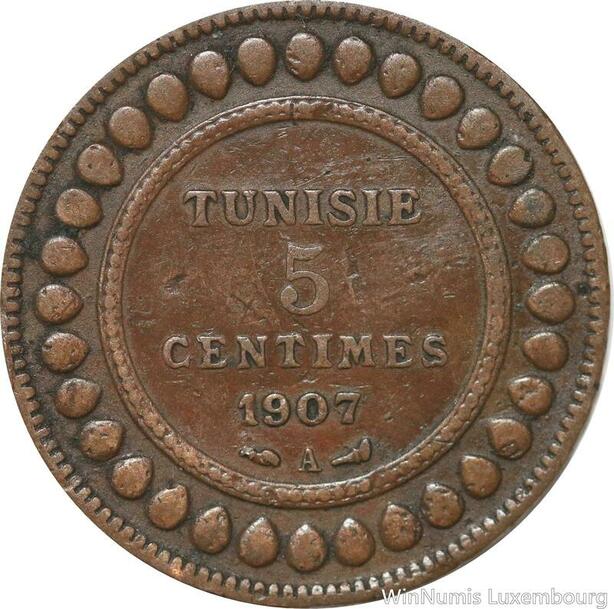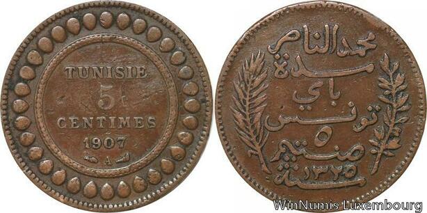 R8589 Tunisia 5 Centimes Muhammad al-Nasir Bey AH 1325 1907 A Paris > Make offer