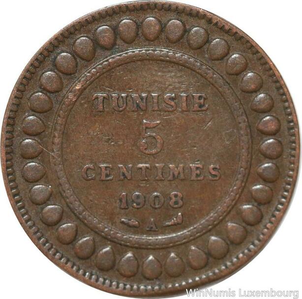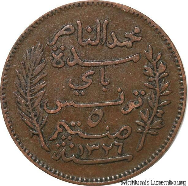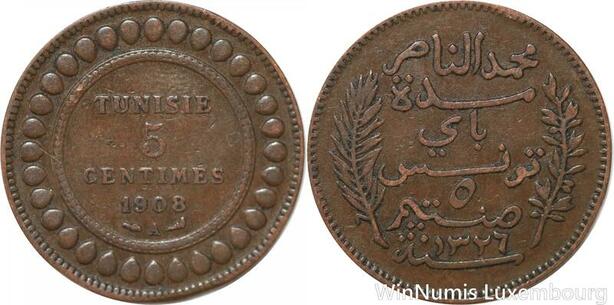 R8591 Tunisia 5 Centimes Muhammad al-Nasir Bey AH 1326 1908 A Paris > Make offer