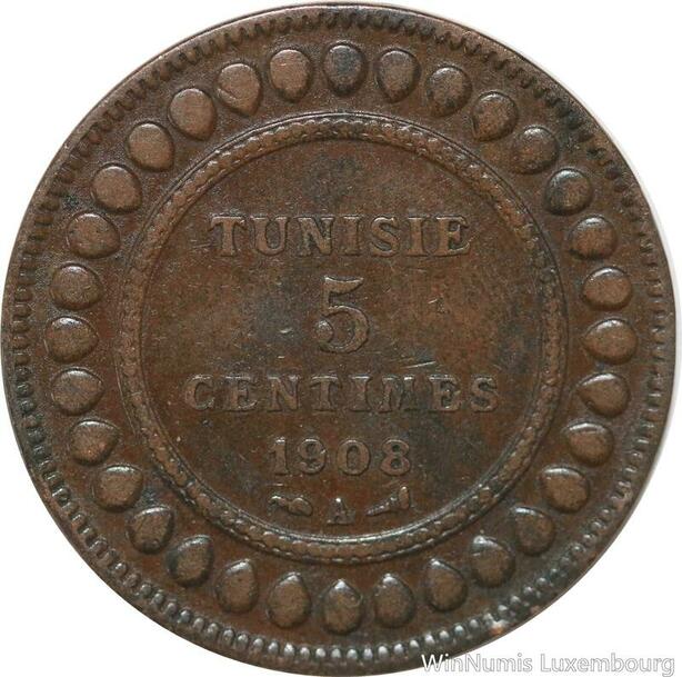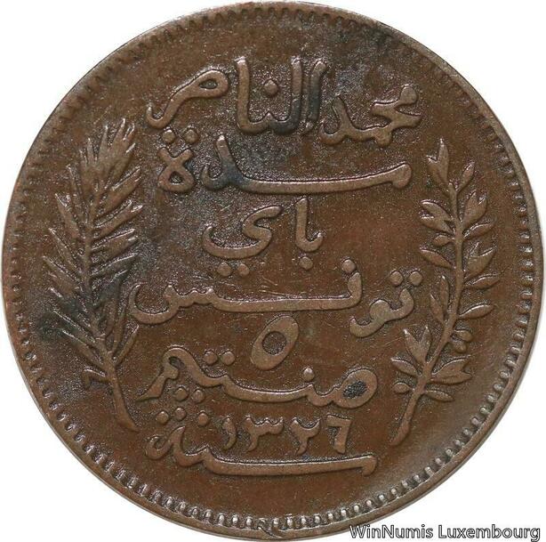 R8596 Tunisia 5 Centimes Muhammad al-Nasir Bey AH 1326 1908 A Paris > Make offer