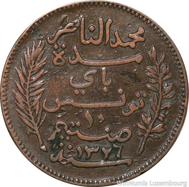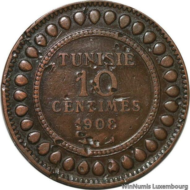 R8651 Tunisia 10 Centimes Muhammad al-Nasir Bey AH 1326 1908 A Paris -> M offer