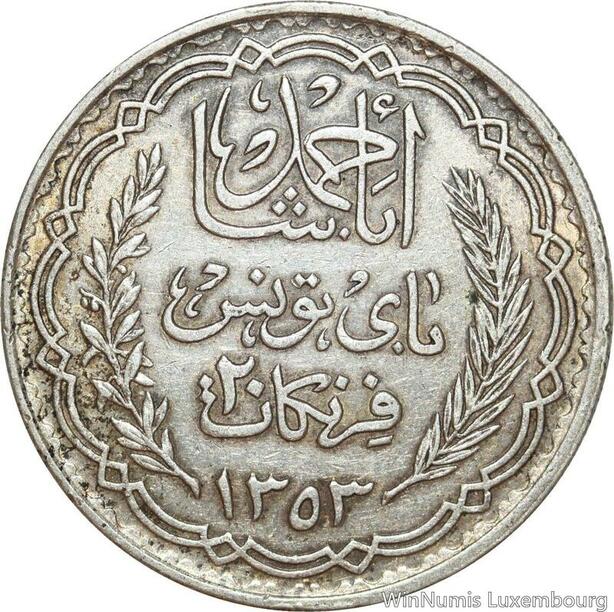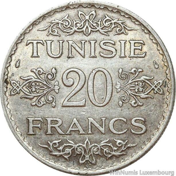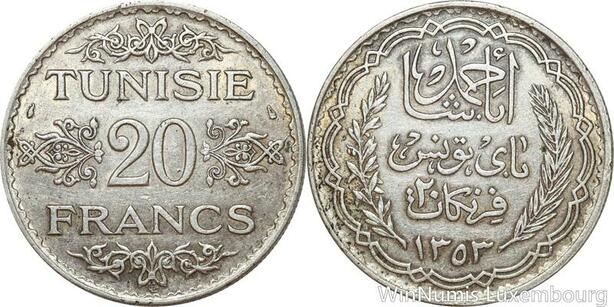 R8719 Tunisia 20 Francs Ahmad Pasha French Protectorat AH 1353 1935 Paris Silver