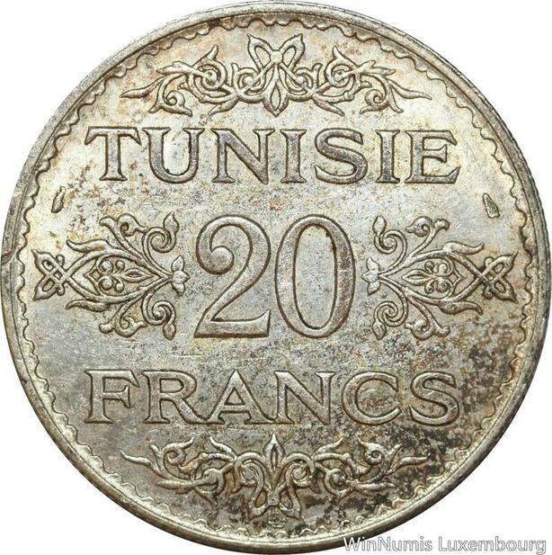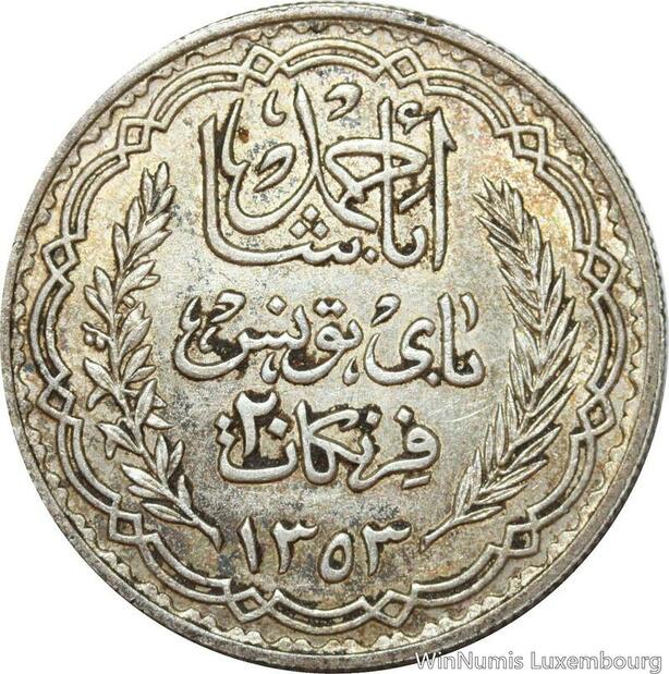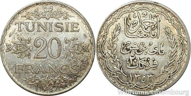 R8720 Tunisia 20 Francs Ahmad Pasha French Protectorat 1353 1935 Paris Silver AU