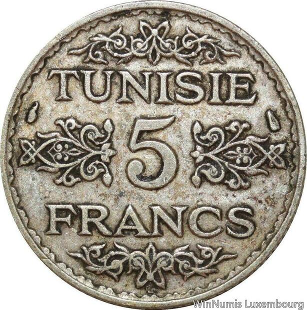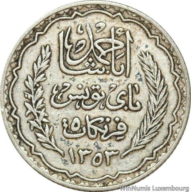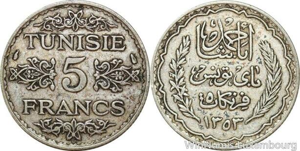 R8725 Tunisia 5 Francs Ahmad Pasha French Protectorat AH 1353 1935 Paris Silver