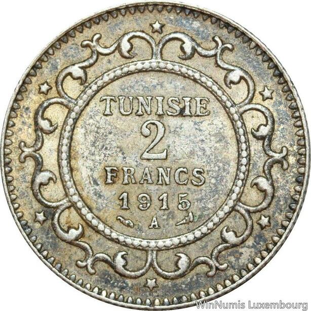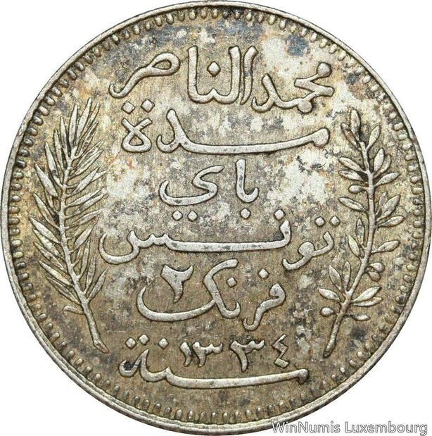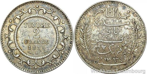 R8728 Tunisia 2 Francs Muhammad al-Nasir Bey AH 1334 1915 A Paris Silver ->Offer