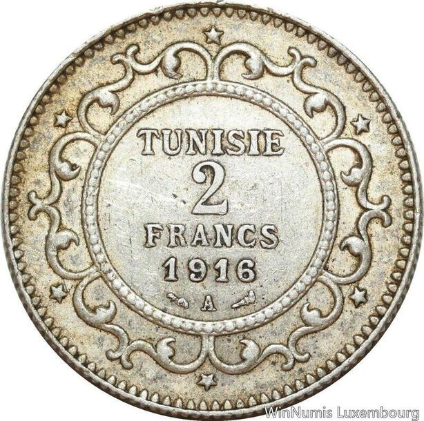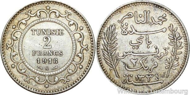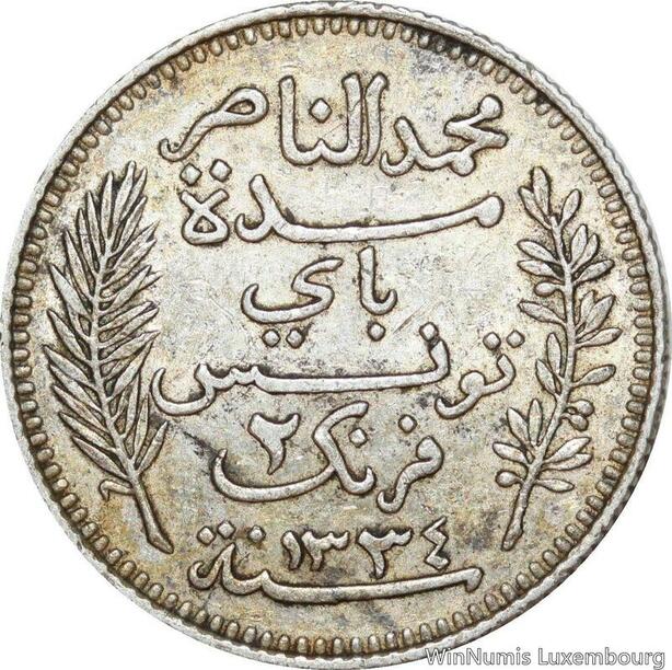 R8729 Tunisia 2 Francs Muhammad al-Nasir Bey AH 1334 1916 A Paris Silver ->Offer