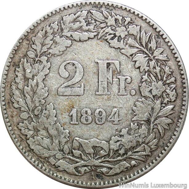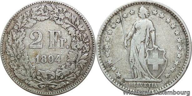 R8797 Switzerland 2 Francs Helvetia 1894 A Paris Silver -> Make offer