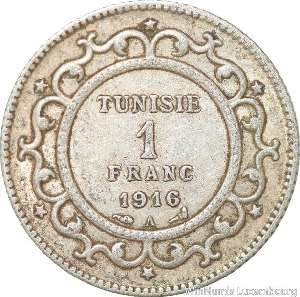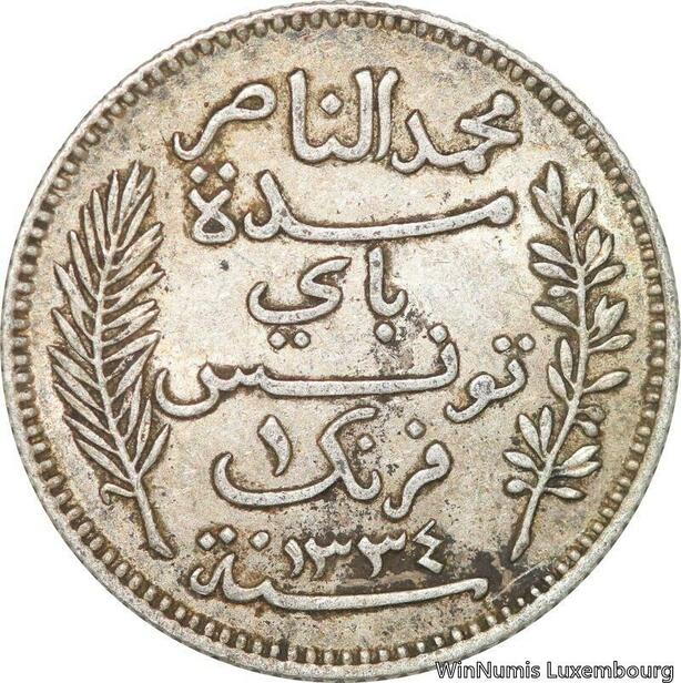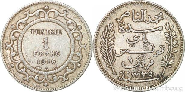 R8833 Tunisia 1 Franc Muhammad al-Hadi Bey AH 1334 1916 A Paris Silver >M Offer