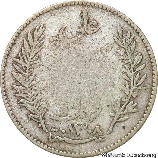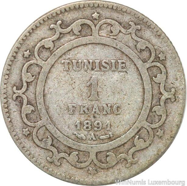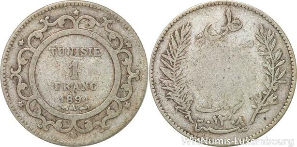 R8837 Tunisia 1 Franc Muhammad al-Hadi Bey AH 1308 1891 A Paris Silver >M Offer