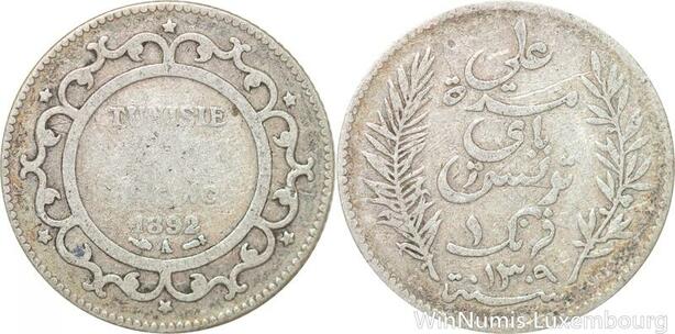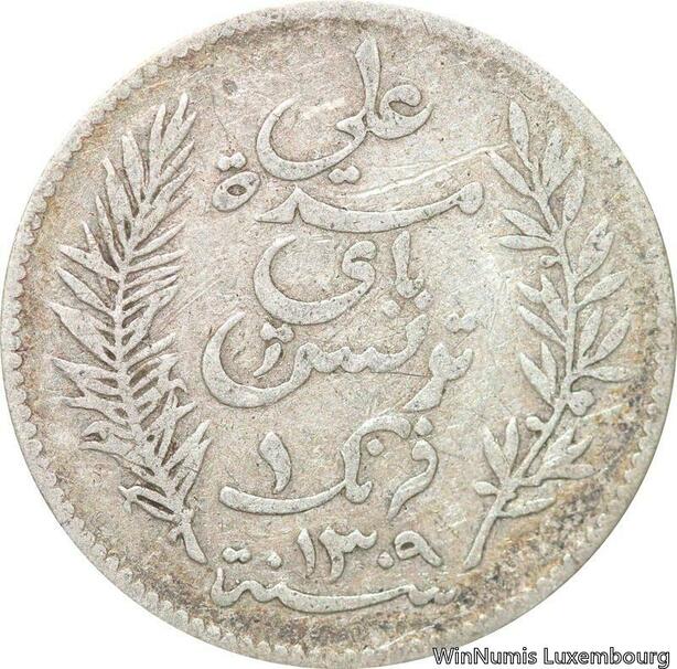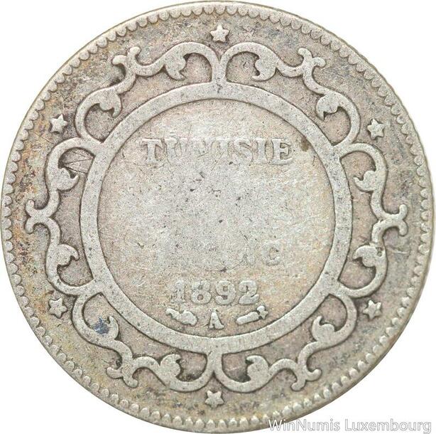 R8838 Tunisia 1 Franc Muhammad al-Hadi Bey AH 1309 1892 A Paris Silver >M Offer