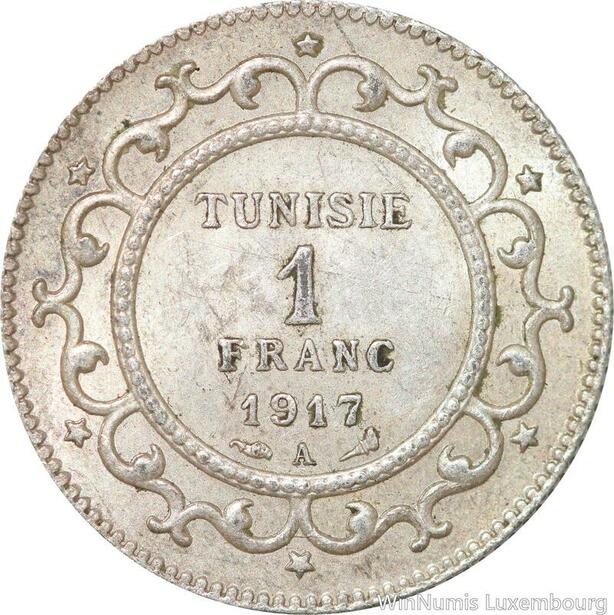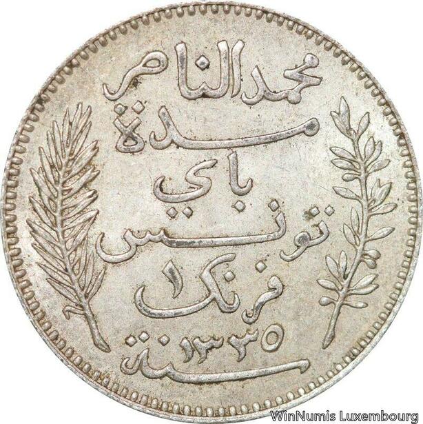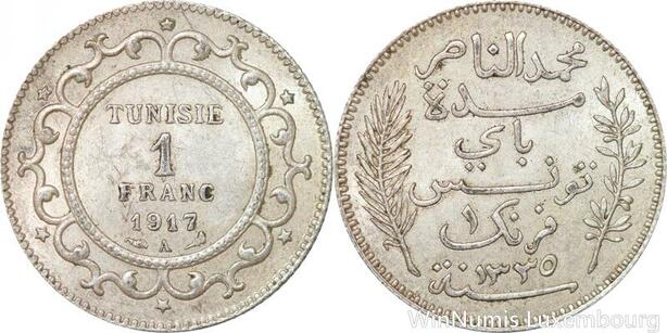 R8842 Tunisia 1 Franc Muhammad al-Hadi Bey AH 1335 1917 A Paris Silver AU >Offer