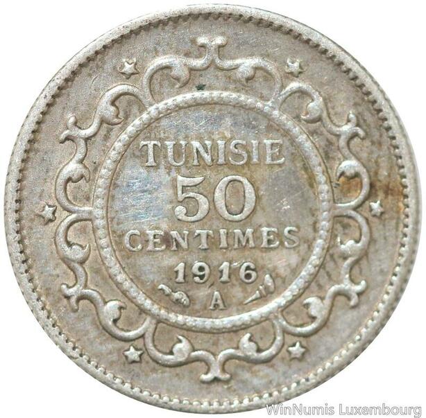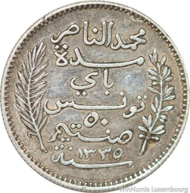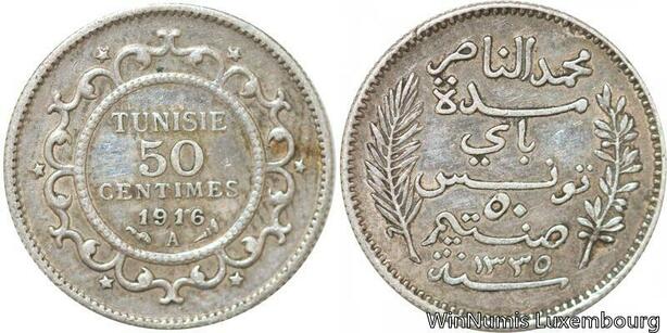 R8871 Tunisia 50 Centimes Muhammad al-Nasir Bey AH 1335 1916 A Paris Silver