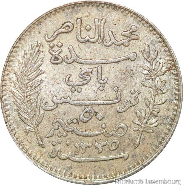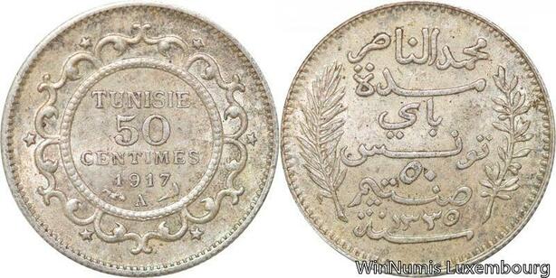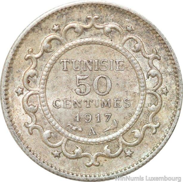 R8872 Tunisia 50 Centimes Muhammad al-Nasir Bey AH 1335 1917 A Paris Silver AU