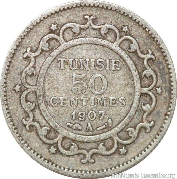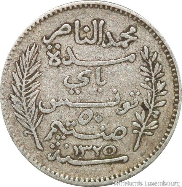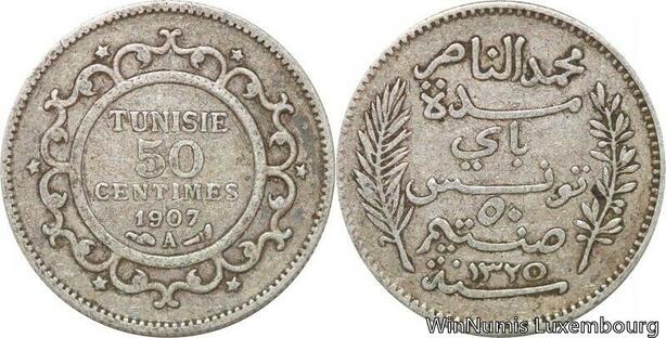 R8873 Tunisia 50 Centimes Muhammad al-Nasir Bey AH 1325 1907 A Paris Silver