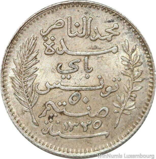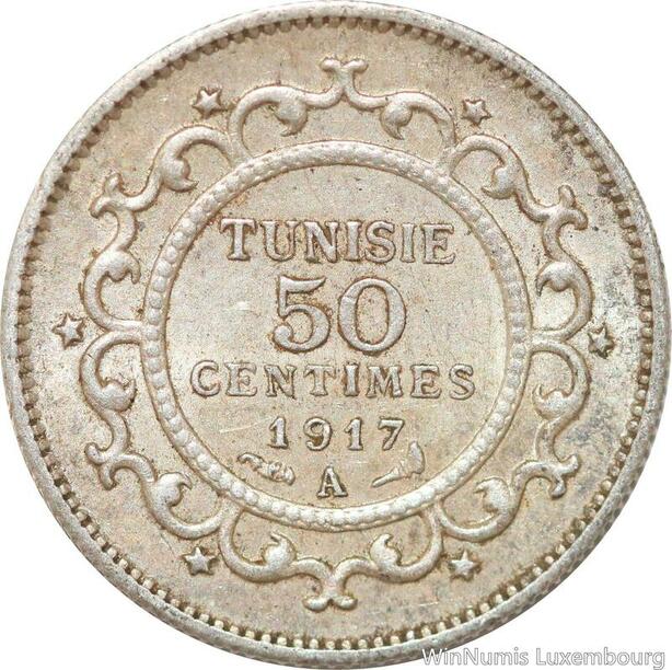 R8874 Tunisia 50 Centimes Muhammad al-Nasir Bey AH 1335 1917 A Paris Silver AU