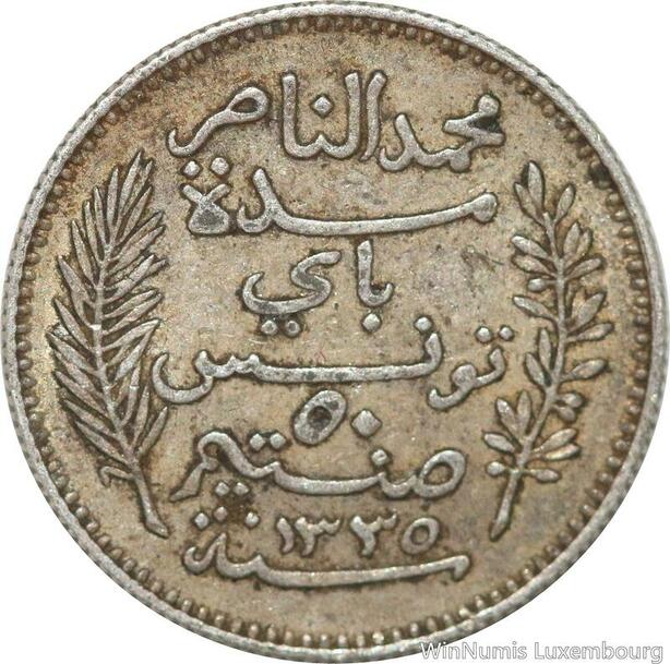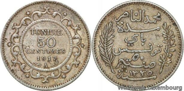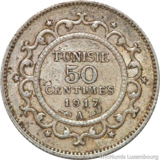 R8876 Tunisia 50 Centimes Muhammad al-Nasir Bey AH 1335 1917 A Paris Silver