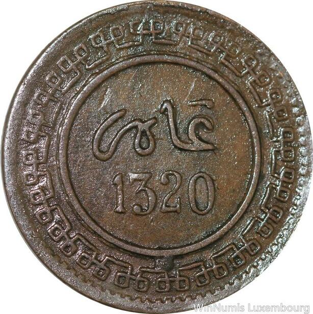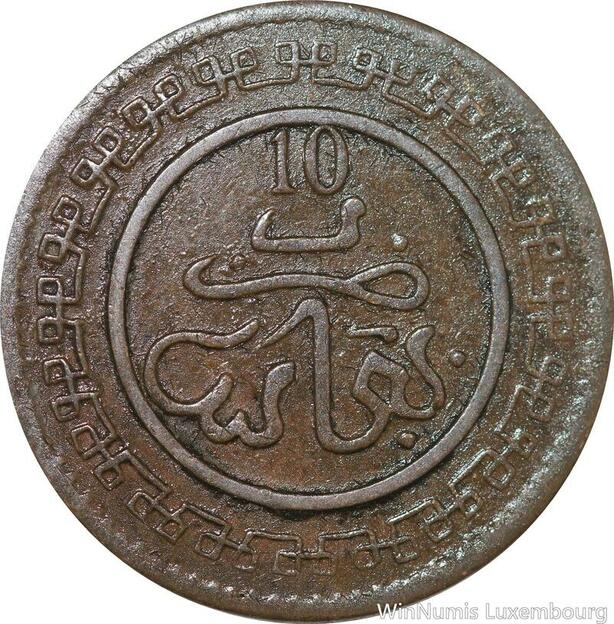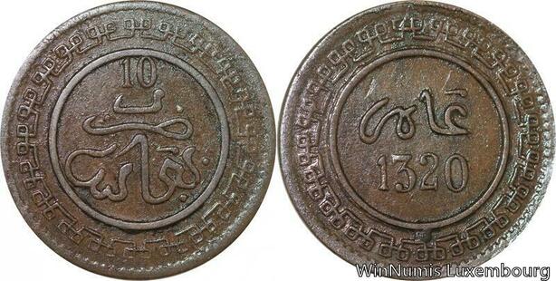 R9034 Very Rare Morocco 10 Mazounas Abd Al Aziz AH 1320 1903 Fes Small Letters