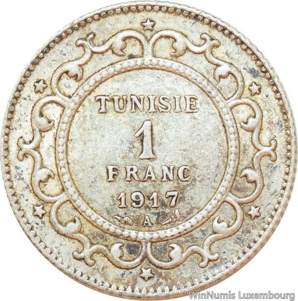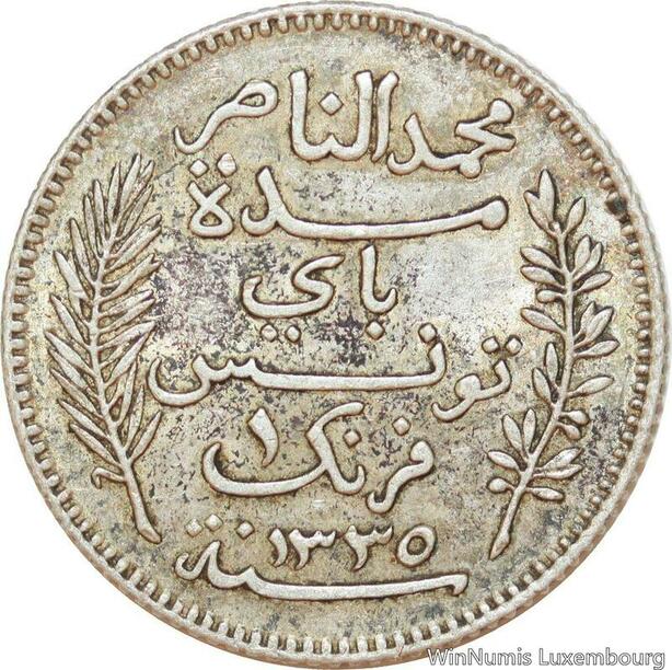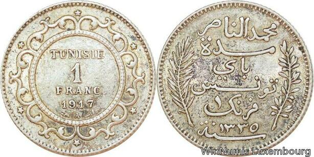 R9077 Tunisia 1 Franc Muhammad al-Nasir Bey AH 1335 1917 A Paris Silver ->Offer