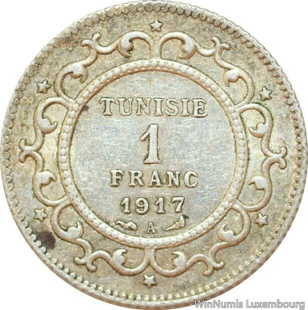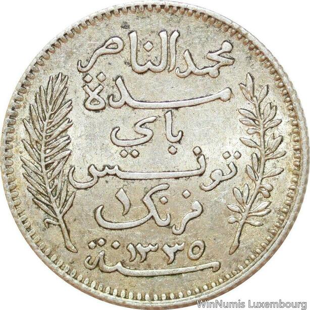 R9088 Tunisia 1 Franc Muhammad al-Nasir Bey AH 1335 1917 A Paris Silver ->Offer