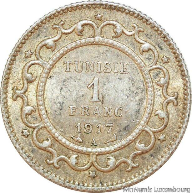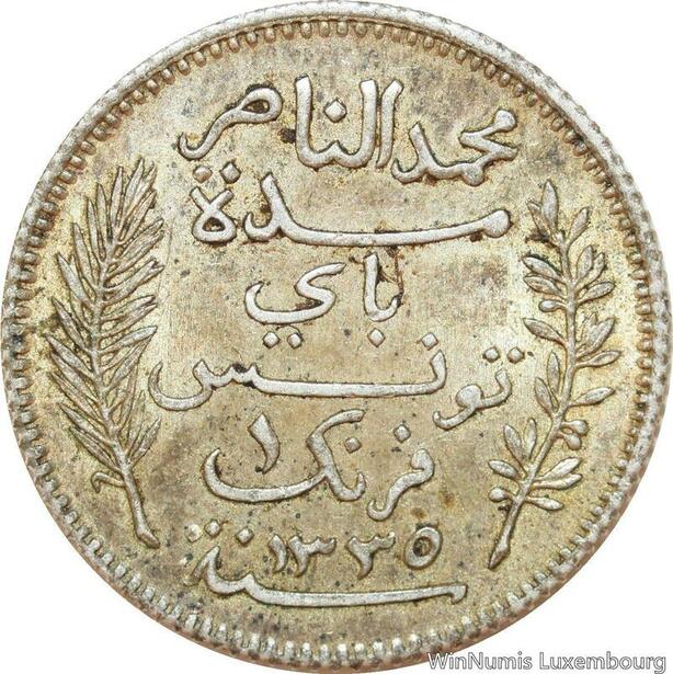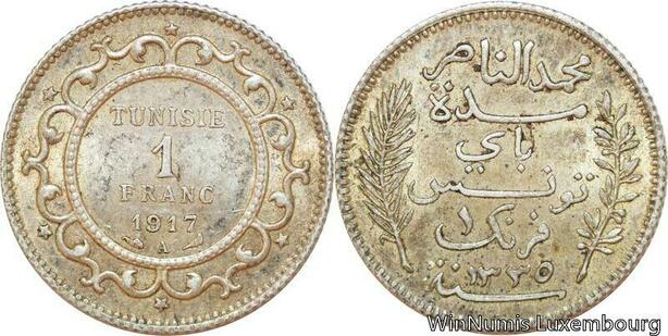 R9089 Tunisia 1 Franc Muhammad al-Nasir Bey AH 1335 1917 A Paris Silver AU