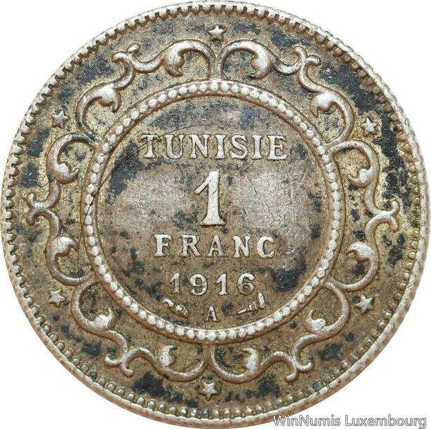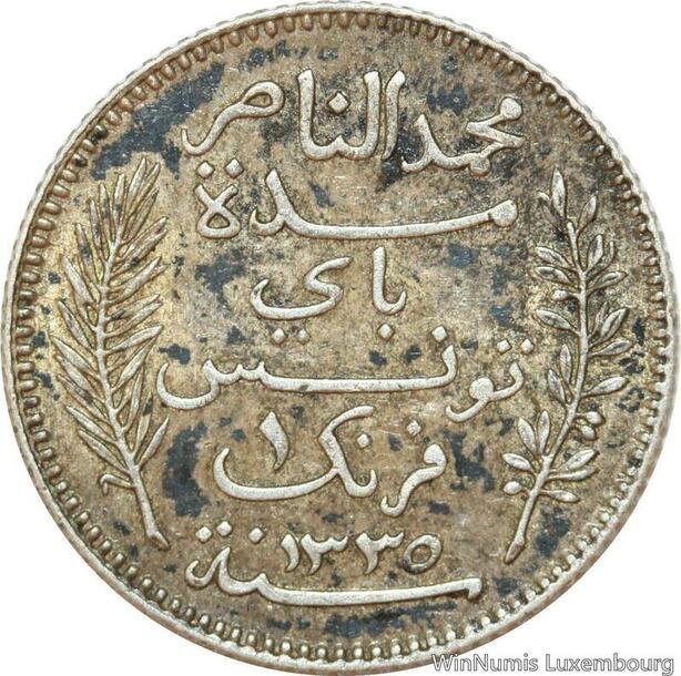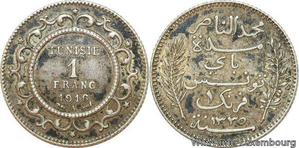 R9090 Tunisia 1 Franc Muhammad al-Nasir Bey AH 1335 1916 A Paris Silver ->Offer
