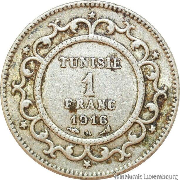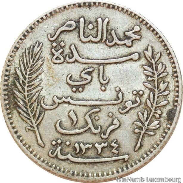 R9095 Tunisia 1 Franc Muhammad al-Nasir Bey AH 1334 1916 A Paris Silver ->Offer