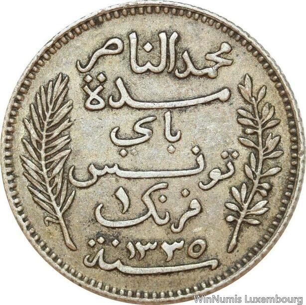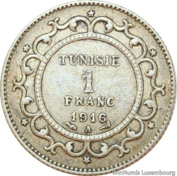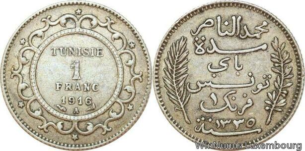 R9103 Tunisia 1 Franc Muhammad al-Nasir Bey AH 1335 1916 A Paris Silver ->Offer
