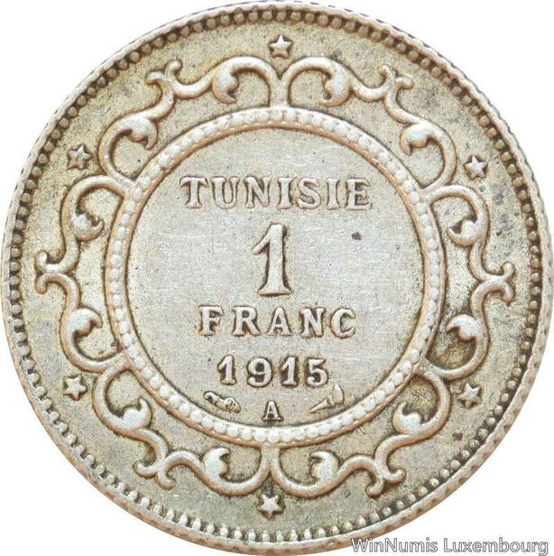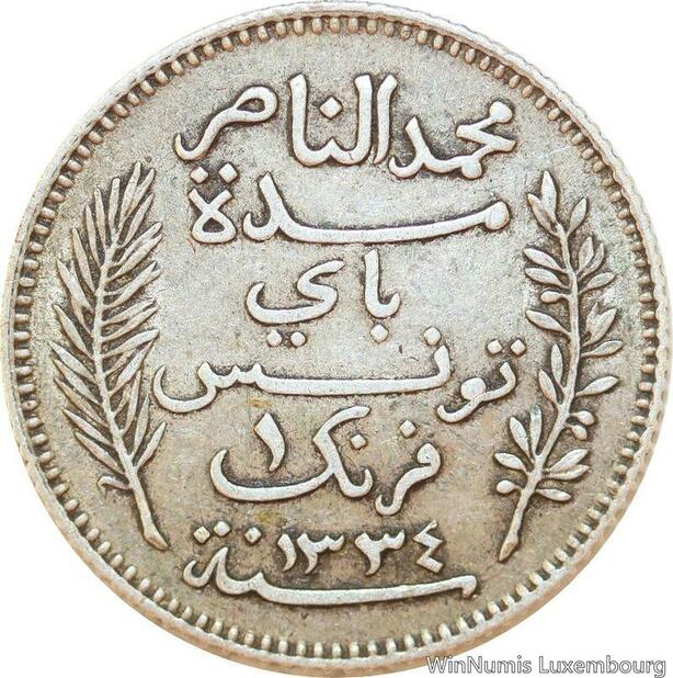 R9105 Tunisia 1 Franc Muhammad al-Nasir Bey AH 1334 1915 A Paris Silver ->Offer