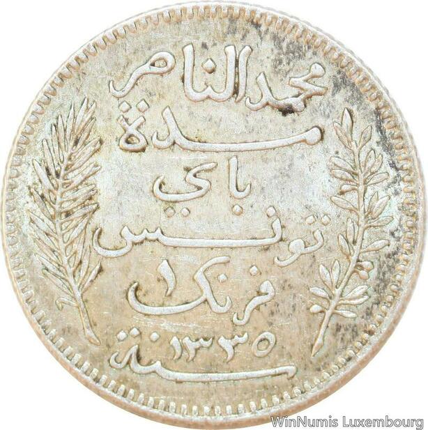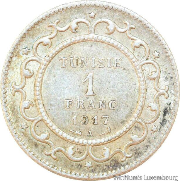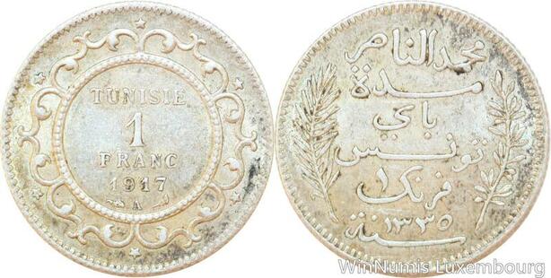 R9106 Tunisia 1 Franc Muhammad al-Nasir Bey AH 1335 1917 A Paris Silver AU