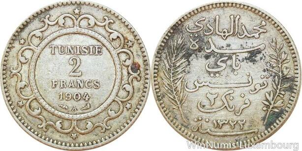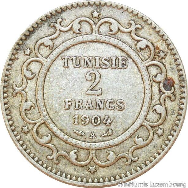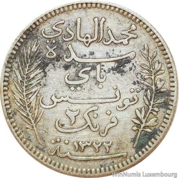 R9112 Rare Tunisia 2 Francs Muhammad al-Hadi Bey AH 1322 1904 A Paris Silver
