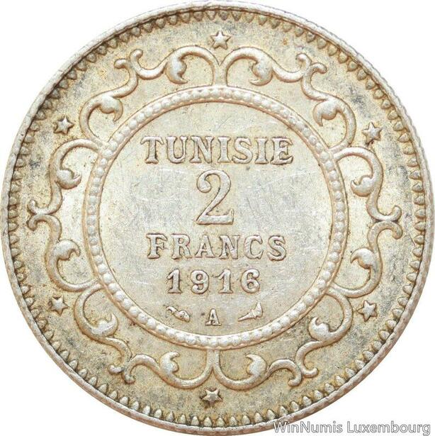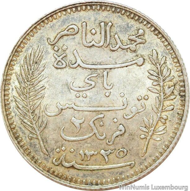 R9113 Tunisia 2 Francs Muhammad al-Nasir Bey AH 1335 1916 A Paris Silver AU