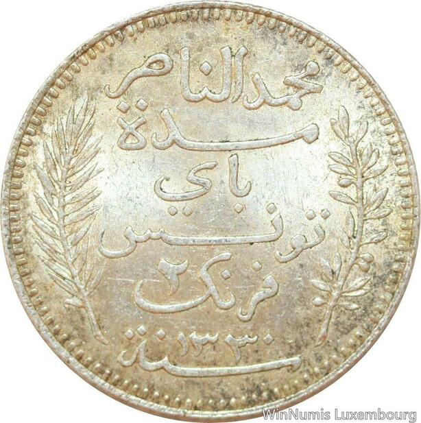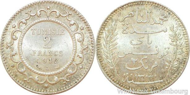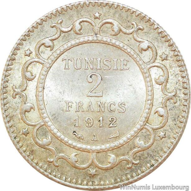 R9114 Tunisia 2 Francs Muhammad al-Nasir Bey AH 1330 1912 A Paris Silver UNC