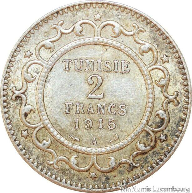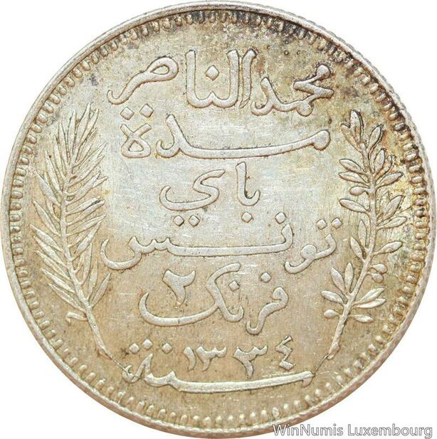 R9115 Tunisia 2 Francs Muhammad al-Nasir Bey AH 1334 1915 A Paris Silver ->Offer