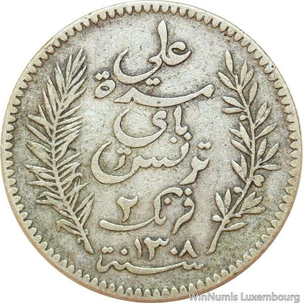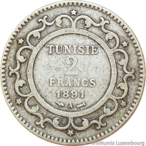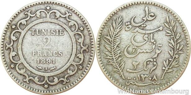 R9116 Tunisia 2 Francs Ali Bey AH 1308 1891 A Paris Silver -> Make offer