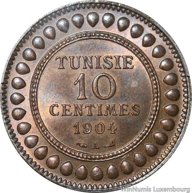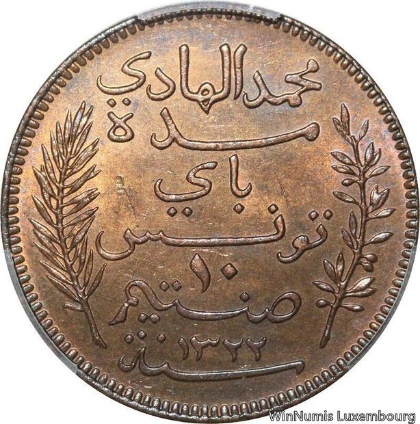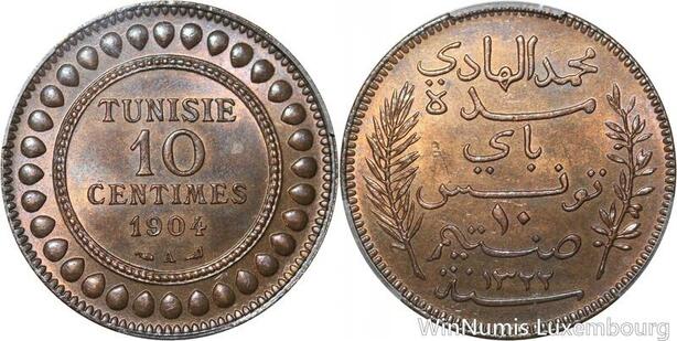 R9127 Rare Tunisia 10 Centimes Muhammad al-Hadi Bey 1904 A Paris PCGS MS62 RB