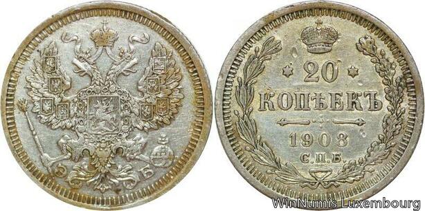 R9404 Russia 20 Kopeks Nicholas II 1908 EB St Petersburg Silver -> Make offer